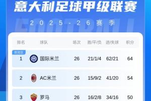 体育资讯02月23日讯 意甲第26轮,罗马3-0克雷莫内塞,米兰0-1帕尔马。