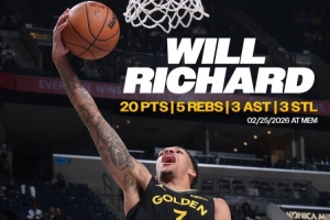 此役,勇士次轮56号秀威尔·理查德出战29分35秒,投篮15中9,三分6中2,罚球1中1,得到21分5篮板6助攻3抢断,得分生涯第二高(最高为30分)。