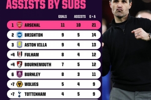 体育资讯3月17日讯 Opta统计了2025/26赛季英超联赛中,各队替补球员贡献的进球和助攻数据,阿森纳位列第一。