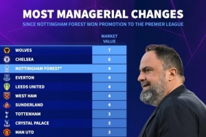22-23赛季以来英超换帅榜:狼队7人最多,切尔西6人,森林即将5人