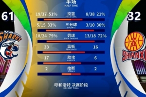 上半场,场上完全呈现出一边倒的局势,上海攻势如潮轰下61分,而山西这边两个单节得分均未能达到20分,并且没有球员得分上双,他们的半场得分甚至比上海次节的单节得分还低,半场过后场上分差已经达到29分。
