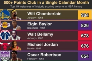 单月总得分Top10:张伯伦984分无敌 乔丹四哈登九 东契奇守门员