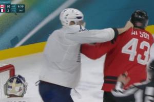 打球热身…冬奥冰球赛场法国与加拿大球员互殴,双双被驱逐出场